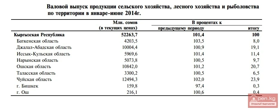 The gross output of agricultural products, forestry, and fishing in January-June 2014 amounted to 52,263.7 million soms, which is 1.4 percent higher than the level of the corresponding period last year.