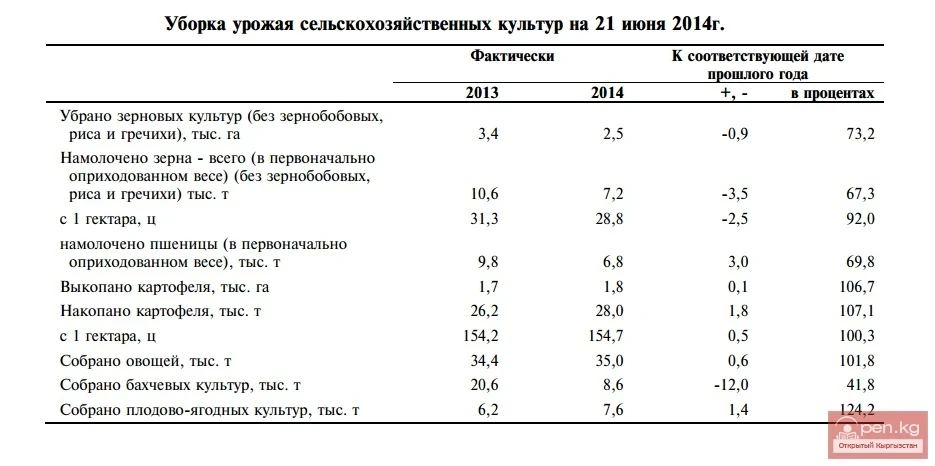 The slowdown in the harvesting of grain crops across the republic is due to their significant lag compared to the corresponding date last year in the farms of Jalal-Abad (more than 2 times), Osh (by 70.6 percent), and Chui (by 75.6 percent) regions.