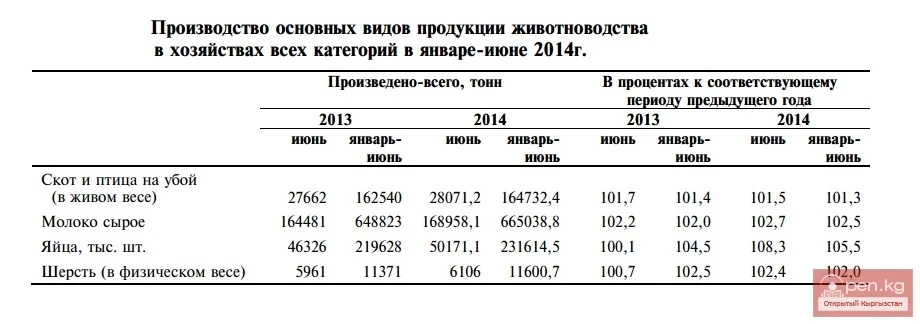 The production of livestock and poultry for slaughter (in live weight) in January-June of this year compared to January-June of last year increased by 1.3 percent, milk - by 2.5 percent, eggs - by 5.5 percent, and wool - by 2 percent, which is attributed to the increase in livestock and poultry numbers.