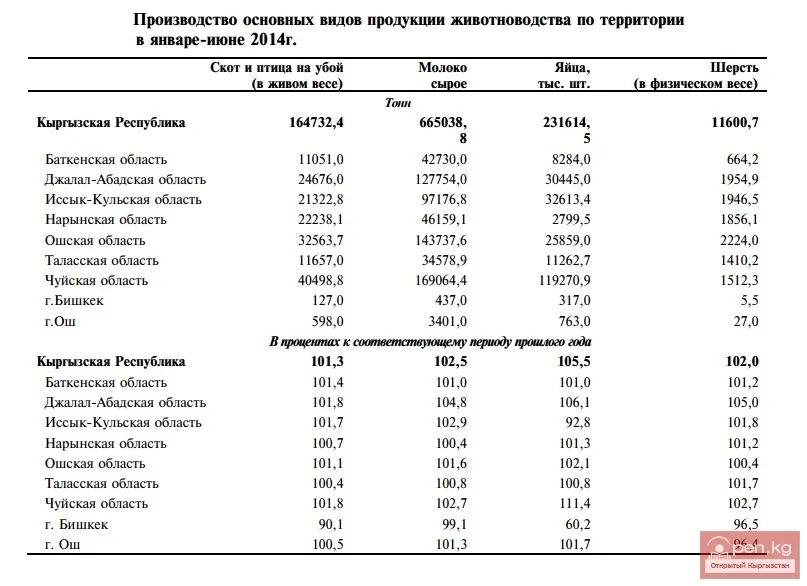 Egg production increased in the farms of Chui, Jalal-Abad, Osh, Naryn regions, and the city of Osh, while wool production increased in the farms of Jalal-Abad, Chui, Issyk-Kul, and Talas regions.