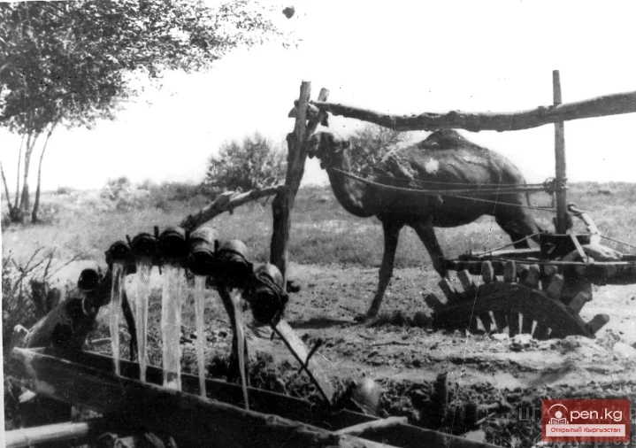 Across ravines, the channel of the ditch was thrown over troughs noo, made from solid hollowed trunks, sometimes on supports turkuk (Kusheleva, 1890. p. 67). From large channels and ditches branched off small irrigation networks, directly connected to irrigated areas. The shortest ditch was called kol aryk, a longer one - ostyon, and wide channels that could freely accommodate the yoke moyunturuk were called alysh. The place on the bank of the ditch zhygaan, where one could direct the channel for irrigating a plot, was called kulak (RF IYAL NAK KR. A. Chorobaev. Inv. No. 5107). An experienced person kybacha led the laying of the ditches. To determine the optimal route of the flow, they used a donkey, which was sent down the slope of the mountain - along the line formed by sand spilling from the holes in the bags on its back, a channel was laid.