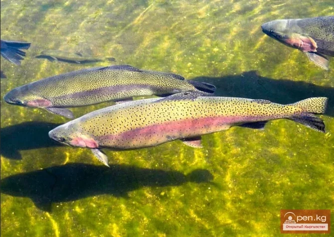 Rainbow trout is an important object of aquaculture and acclimatization work. It was introduced to Kyrgyzstan in the 1970s at the Ton fish farm, where it is bred artificially. Fishermen at Issyk-Kul report that there have been cases of catching rainbow trout in Lake Issyk-Kul weighing up to 5 kg. It differs from the Issyk-Kul trout (hegar-kuni) by its higher body and bright coloration.