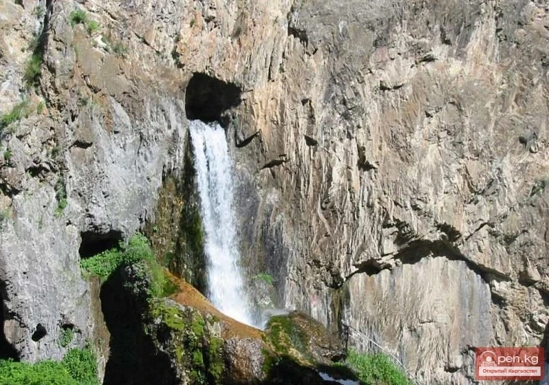 Three kilometers from the mouth of the narrow gorge is the main attraction of the area - the famous Abshir-Sai Waterfall, which is a unique creation of nature, declared a monument. From a round opening about two meters in diameter in a sheer hundred-meter wall, a torrent of sparkling water bursts forth, enveloped in clouds of water dust. In the vicinity of the waterfall, there are two other sites of great interest to tourists. These include the Kotur-Bulak spring with crystal clear cool water flowing from underground depths, located inside a huge karst grotto on the left cliff of the canyon. Ten kilometers from it is the dammed Abshir-Sai Lake, from which the Abshir-Sai river flows through the dam. Surrounding it are humped peaks with scorched grass. The gentle slopes are covered with rock debris and juniper forest.