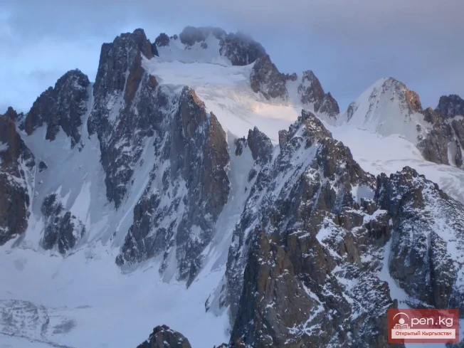 From here, the steepness of the rocky bastions is clearly visible. The dominant position among the bastions is occupied by the spur of the first tower of Korona. Its height is 4240 m. Snow does not settle on the summit of the wall, and the wall remains clean.