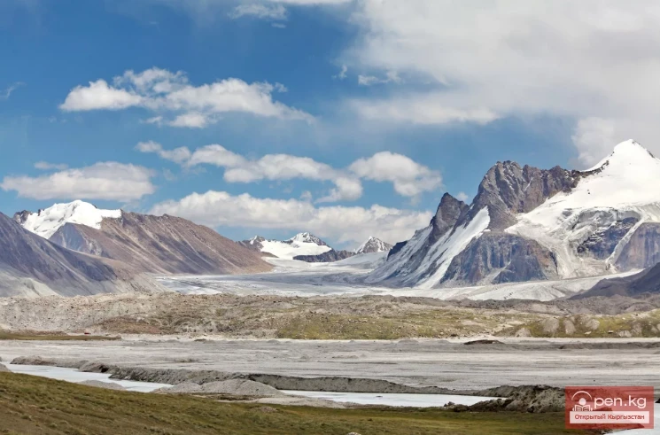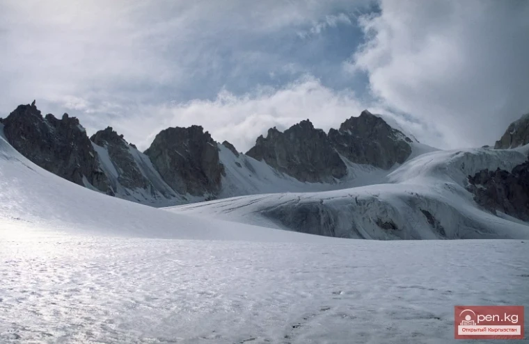 Between the middle and southern ridges lie the glaciers: on the western side - the North Kara-Sai (over 10 km long), and on the eastern side - Kainy (Koendy) (over 8 km long). The western slopes of Akshiyrak are covered by an almost continuous firn cover. The total number of glaciers in the massif is over 130, with an area of glaciation of about 450 sq. km. The tongues of the glaciers lie at altitudes of 3700-4100 m, with the snow line at 4100-4400 m depending on the slope exposure.