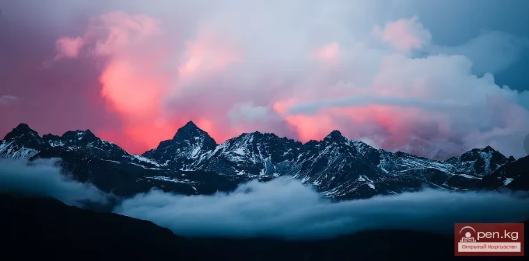 Kungey-Alatau is a relatively narrow alpine chain. The width of the ridge in its highest part is 30-35 km. The maximum heights are in the Chotkal massif (4771 m) and in the middle part of the ridge, in the area adjacent to a powerful uplift extending to the northwest from the key peak, Pik Kemin (4643 m), towards the Zailiysky Alatau ridge, known as the Chilik-Kemin saddle. There are many beautiful peaks with heights of 4500 - 4600 m, and here the Zailiysky and Kungey-Alatau ridges come so close that the distance between their ridge lines is reduced to 8 km. The Chilik-Kemin saddle serves as a watershed between the two largest rivers in the area - Chilik and Chon (g)-Kemin.