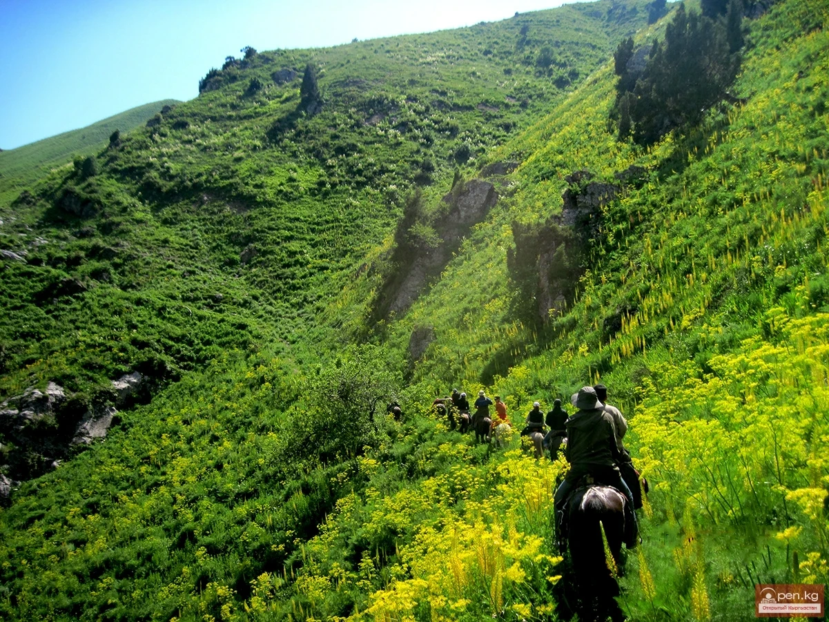 In the subalpine zone of the reserve lies a plateau — a monument to an ancient geological catastrophe. A natural dam covering an area of about fifteen square kilometers, supporting Lake Sary-Chelek, was formed as a result of the collapse of two ridges. The landslide blocked the river, creating a lake. The fractures of the ridges and depressions on the giant landslide filled with water and became six more lakes, the shores of which are covered with vegetation reminiscent of a savanna. Over the two-meter tall grass rise millennia-old junipers. The alpine zone is harsher, with an arctic climate and prolonged winters. The landscape matches the climate. But even here, one can often encounter the Siberian ibex, snow leopards, and marmots. The cliffs here are inaccessible in the most literal sense of the word, not metaphorically. It is no coincidence that the ancient Eastern warning sounds so vividly: “Traveler! You are like a tear on an eyelash, be careful!” In this land, every lake or river, every peak and every animal has its own legend or myth. Try to explain without myth-making why Lake Sary-Chelek has “no bottom” even at its shores. Or why Lake Kara-Kel is “dead” — birds do not land on it, there are no fish or algae, and its shores are desolate. The plant world also holds many mysteries. The prango blooms abundantly in the Sary-Chelek zone — a plant with hairy leaves and bright yellow flowers. The honey plant, used as fodder for livestock in winter (it is poisonous in its green form), can be quite unkind to newcomers: contact with its hairy leaves causes the skin to break out in huge blisters. Folk belief states that the only way to relieve the ailment is to rub the palms with soil taken from under the roots of the prango. Apparently, due to the color of the abundant grass here, it has been given the current household name “yellow barrel” or “yellow bucket.” However, old maps provide its former, “real” name: Tuskaul. This name belongs to a hero of the folk epic who accomplished a series of glorious feats, which the locals are happy to recount while pointing to the earthen mound on the southern shore of the lake, where the hero's grave is located. His horse is still alive, and occasionally, in the twilight, a white horse emerges from the depths of the lake, grazing on the grass along the shores. One of the legends tells of a gigantic snake that lives in the lake.