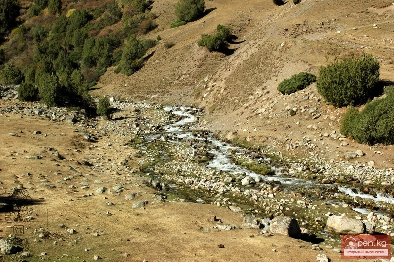As the altitude increases (1800 m), small sparse forests of juniper and shrubs gradually transition into juniper thickets (2000 m). The abundance of beautiful glades with babbling brooks surrounded by groups of trees, with the pleasant rustle of leaves in the gusts of wind and the scent of juniper forests, turns them into comfortable places for leisurely relaxation. The river in this section is fast, which adds to its special appeal. Occasionally, dull thuds can be heard from stones colliding, which the swift water does not allow to rest peacefully. The steeply rising gorge widens at its sources into a valley — the Salyk tract, overgrown with a variety of alpine meadow grasses and adorned with picturesque scattered rock fragments. The river spreads widely across the valley floor. In the upper part of the left bank of the gorge, in a narrow gorge framed by cliffs, there is a small waterfall.