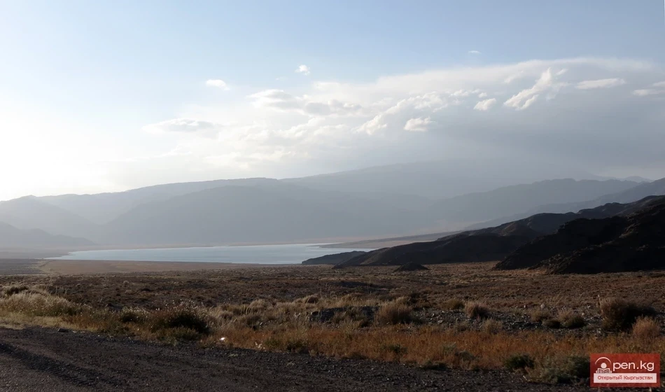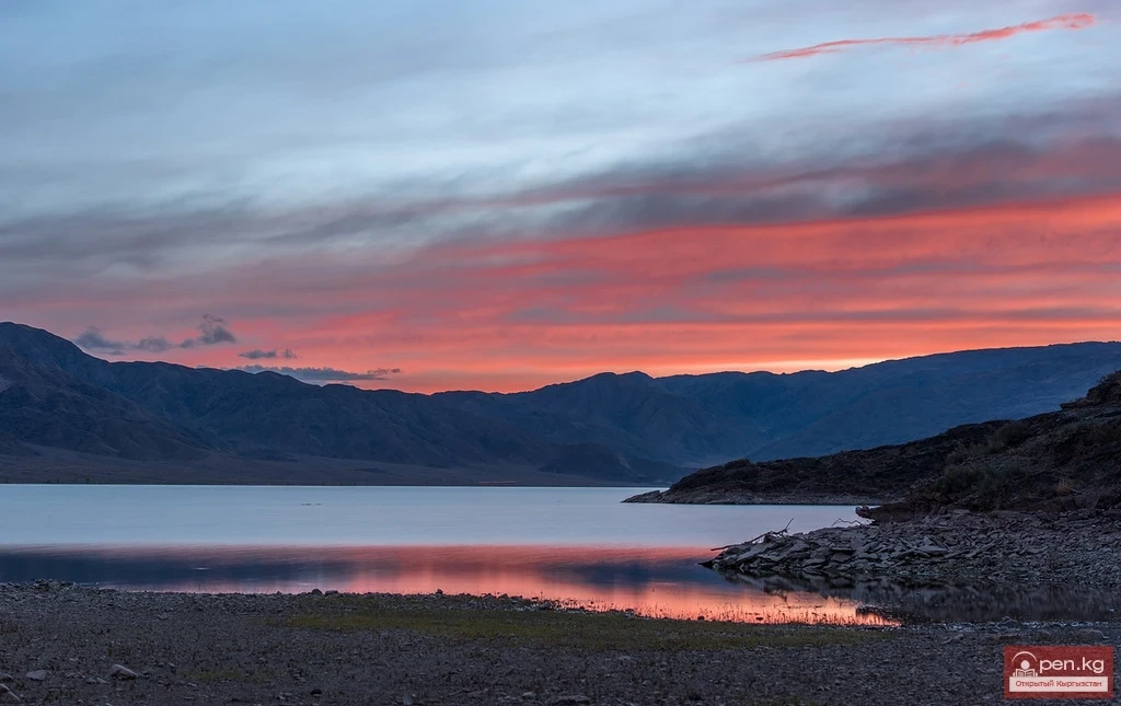 At the beginning of the zone, the Chu River stretches the Orto-Tokoy Reservoir, which is 18 kilometers long, surrounded on three sides by cliffs and by a dam to the north. The reservoir has a capacity of 4700 million cubic meters, with a water temperature of 14 degrees, a mirror area of 24 square kilometers, and a water level of 1762 m. The dam height is 52 m, and its length along the crest is 362 m. Water is released through a pipeline in a tunnel drilled into the rocks, which is 576 m long. The turquoise color of the water is complemented by the reddish and yellow slopes of the mountain ranges. The area is desolate, with only the floodplain of the Chu River overgrown with shrubs and cozy bright green meadows. The scorching silence is interrupted by gusts of cool wind from the surrounding mountains. Majestic stone debris (korum) approaches closely to the river's floodplain, with cracked rocks bearing dark brown spots of "sunburn."