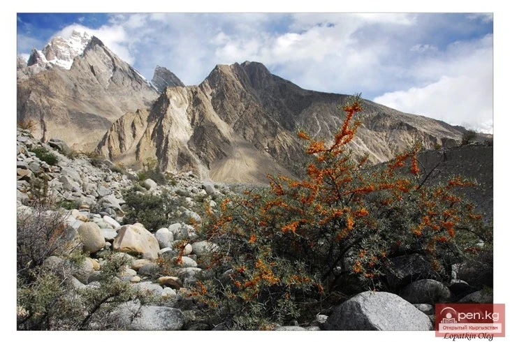 Along the floodplain of the Naryn, there are dense thickets of tugai forests, pleasantly enlivening the surrounding steppe landscape. The natural composition of these forests is very rich, including the laurel-leaved poplar, Tien Shan birch, crooked birch, sharp-leaved and Dzhungarian willows, as well as numerous shrubs, among which the mirkaria and the very valuable and tasty sea buckthorn stand out.