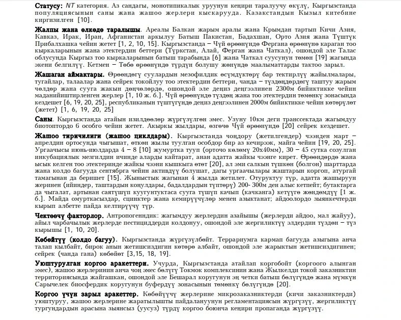 Population. Special studies in Kyrgyzstan have not been conducted. In suitable biotopes, up to 6 specimens are found on a 10 km transect; in recent years, it has been rarely encountered, especially in the Chuy Valley [20].