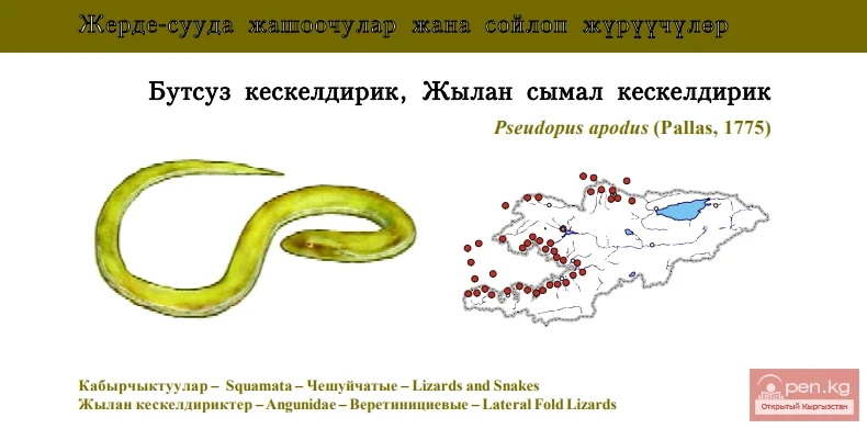 Status: Near Threatened (category NT), a representative of a monotypic large apodal lizard genus, with a reducing number in natural populations. Its specific area includes the Balkan and Crimea Peninsulas, Caucasus, and Southwestern Asia up to Balkhash Lake. In Kyrgyzstan, it populates plains and piedmont zones in the Chuy Valley and Fergana region, with mesophytic vegetation, up to 2,000 m above sea level, and is also recorded in the lowest parts of the Talas and Chatkal valleys. It is a diurnal predator, catching invertebrates, small rodents, and skinks; females lay 4-10 eggs in June - July. Lizards are active from March - April up to July, with young appearing the following year after hibernation and achieving reproductive age in their 4th year. The population in Kyrgyzstan is small: up to 6 specimens per 10-km survey in habitats. Limiting factors include agricultural development of habitats (ploughing and pasturage) and direct persecution by people. The species is not bred and is not specially protected in Kyrgyzstan; it is included in the Red Data Book of adjacent Kazakhstan. Development of breeding in captivity and extensive educational work for the public are recommended for the conservation of the species.