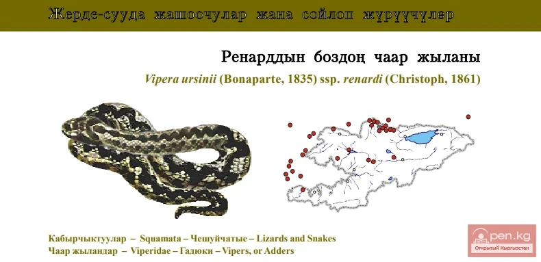 Status: Vulnerable (category VUA4bc), this is a north-Turan-Pontian subspecies of the south-west Palaearctic poisonous snake species, endangered in the country (scanty marginal populations in spur of specific area, in zone of anthropogenic transformation of habitats). It is listed in IUCN RLTS and Uzbek Red Book; European populations are included in Appendix I of CITES. The subspecies is spread from the Bug River and Caucasus up to Altai and Chinese Dzhungaria and also in the part of Tien Shan; in Kyrgyzstan it is recorded in Tchu Valley, northern foothills of Alexander Mountain Range, western part of Talas Valley, southern spurs of Atoinok Mountain Range, Ketmen-Tyube and Middle Naryn Hollows; it populates steppes and riversides in plains and low-montane belt but at present it has vanished in many habitats. It is a viviparous species, hibernation finishes in March - April, young snakes appear in August - September. Prey is mostly acridids, lizards, small mammals and sometimes fledglings. Stock in the country is small: up to 3 specimens per transect 20 km X 4 m. Limiting factors: transformation of habitats, disturbance and persecution by people. Breeding in captivity is absent in Kyrgyzstan. At present time it is protected by common routine, possible in Karatal-Japyryk Natural Reserve and in Tokmak wildlife area only. Options offered to protect this species are as follows: creation of micro-reservations, prohibition of export and awareness building work among people about falsity of value for traditional medicine.