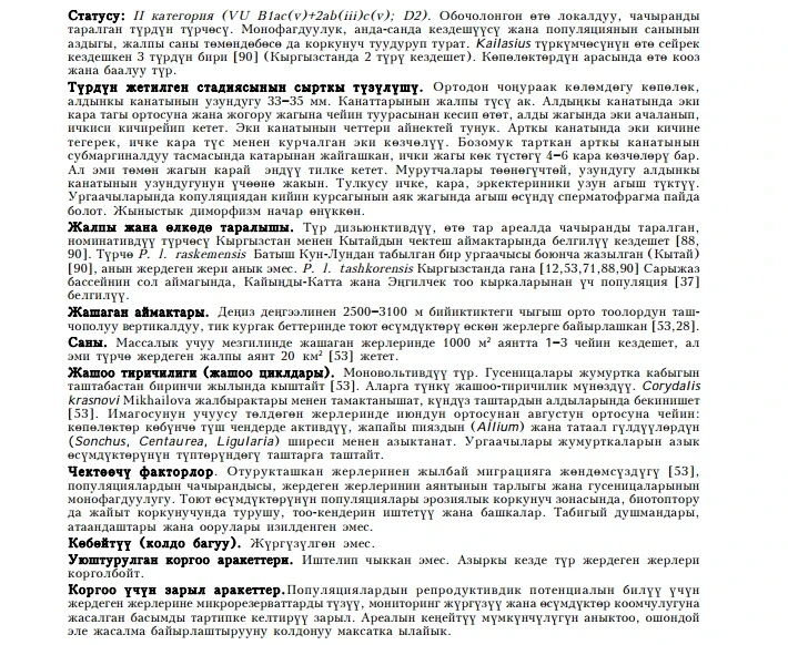 Status: Category II (VUB1ac(v)+2ab(iii)c(v); D2). An isolated subspecies of an extremely locally and sporadically distributed species, which, due to monophagy, singularity, locality, and small population sizes, is vulnerable even in the absence of a decline in numbers. One of three [90] rare representatives of the peculiar subgenus Kailasius (two species in Kyrgyzstan). It represents significant scientific interest in aspects of zoogeography, evolution, study, and conservation of the regional gene pool. One of the most striking and aesthetically valuable species of butterflies.