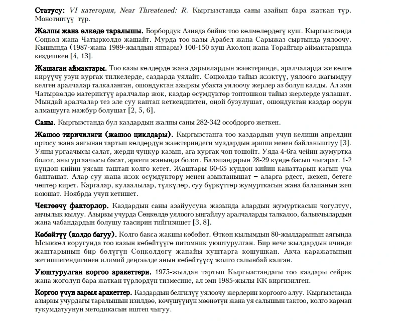 Population. In 1992-96, the Son-Kul population consisted of 44-49 individuals, of which 3-5 pairs were nesting. In the period 2002-2003, 15-17 individuals were noted, but none nested, and in 2004 - 2 birds. The Chatyr-Kul population has remained stable at around 300-350 individuals in recent decades, which corresponds to its population level in the 1960s [4, 50]. In the period 1997-2003, the minimum population size was 282-342 individuals, of which 38-45 pairs were nesting.