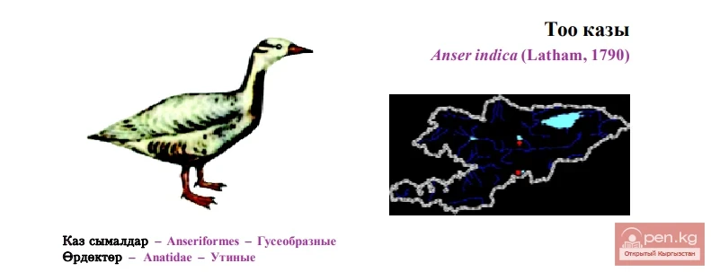 Status: VI category, Near Threatened: R. Monotypic species. Breeds in Song-Kul and Chatyr-Kul Lakes at 3,000 m (9,800 feet) above sea level. There are 5-6 islands in Song-Kul and 10-12 small islands in Chatyr-Kul Lakes, which are used as nesting territories. The geese number has reduced from 44-49 birds in 1992-96 in Song-Kul, out of which 3-5 pairs actually nested, to 15-17 ones in 2002-03, no pair attempted to nest. Chatyr-Kul populations are stable - around 300-350 geese. In 1997-2003 the number ranged between 282-342 birds, and number of nesting pairs - between 38-45 ones. Breeding season starts in April. There are 4-6 eggs in the nest. Enemies are raven, harrier, fox. There is heavy human impact in Song-Kul. Twelve geese are in captivity at Issyk-Kul zapovednik (protected area). During 1992-2002 three breeding pairs delivered 112 fledglings. The bar-headed goose is in the current Kyrgyz Red Data Book of 1985.