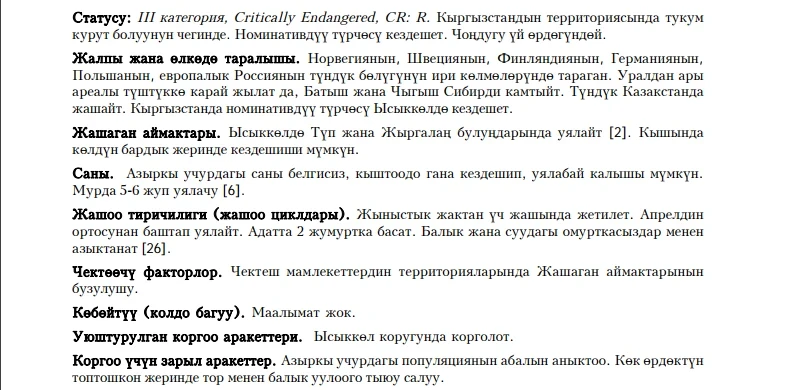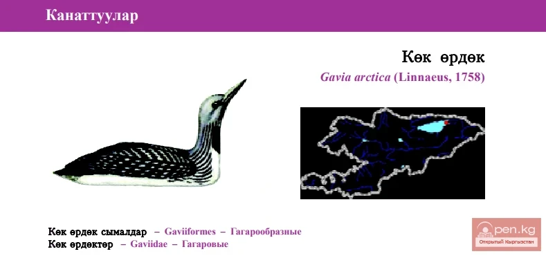 Status: III category, Critically Endangered, CR: R. Breeding species in Kyrgyzstan, critically endangered from the perspective of Kyrgyz ornithologists. Five or six pairs bred in Tyup and Djergalan Bays of Issyk-Kul Lake in the past. No evidence of breeding is reported nowadays. The limiting factor is the destruction of nesting habitats. Winters in large numbers, occurring throughout the lake. Feeds on fish and water invertebrates. Starts nesting in April, producing 2 eggs. It is recommended to limit net fishing in areas where the Loon’s concentrations are high.