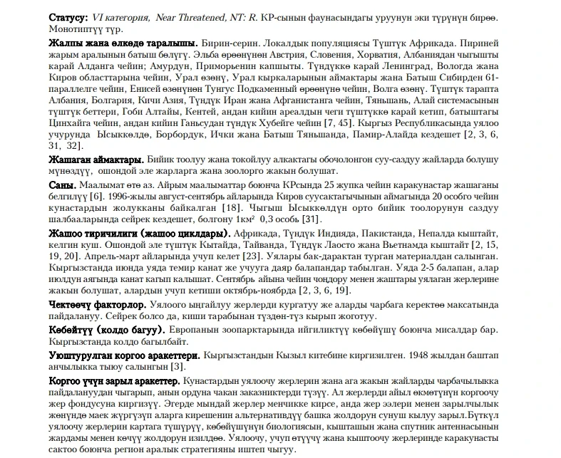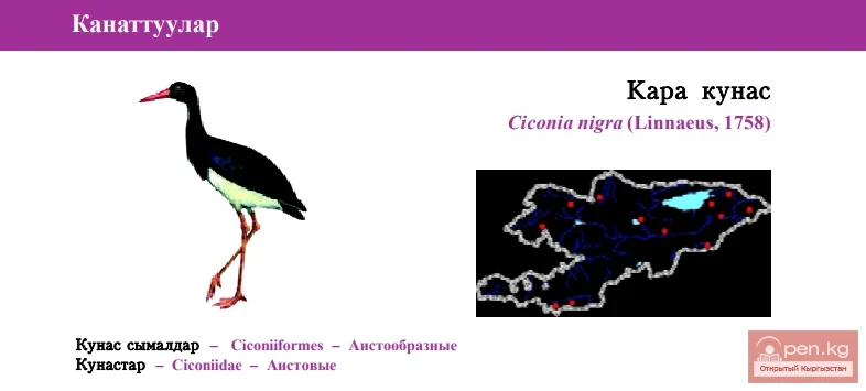 Status: VI category, Near Threatened, NT: R. Monotypic species. Breeds in Issyk-Kul oblast, Central, Inner, Western Tien Shan, Pamir-Altai Mountains. Prefers wetlands in forest, subalpine and alpine belts, close to cliffs and precipices. There are up to 25 pairs breeding in Kyrgyzstan. Twenty individuals were recorded on the shore of Kirov water reservoir in Talas oblast. Black Stork is rare in wet meadows of Eastern part of Issyk-Kul Region (0.3 individuals per km²). Arrives in April-March. Nest is a thick twigs platform. Lays 2-5 eggs. Fledglings are found in nests already in June. Flying juveniles are seen at the end of July. Uses small fish, frogs, mollusks, rarer - insects, small rodents for food. Limiting factors are drainage of suitable nesting habitats, rarer - illegal game shooting. No instances of holding it in captivity. Included in Kyrgyz Red Book, hunting is prohibited since 1948. It is recommended to create mini protected areas around nesting sites. If such land is privatized it is necessary to conduct awareness campaign and suggest to owners alternative sources of income. It is also necessary to map existing nests and develop an interregional conservation strategy of the species.