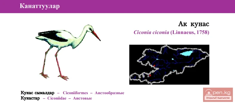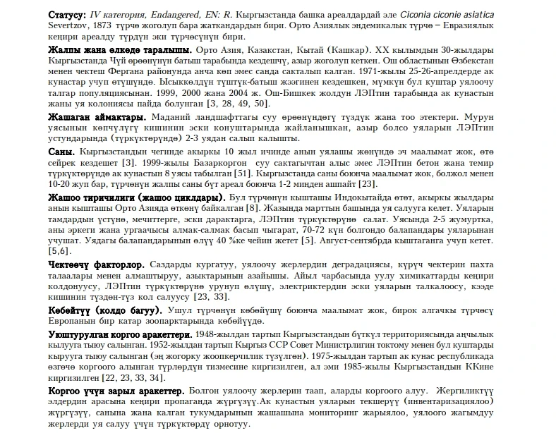 Status: IV category, Endangered, EN: R. Breeds in the Fergana Valley. A colony of 8 pairs of White Storks was found along the Osh-Bishkek road nesting on electrical poles in 1999, 2003, and 2004. Another nest was found in Batken oblast. Twelve migrating birds were recorded in the spring of 1971 on the shore of Issyk-Kul Lake. Prefers plains and uplands in cultivated landscapes. Built nests next to villages in the past. There are probably 10-20 breeding pairs in Kyrgyzstan. Lays 2-5 eggs, both sexes share domestic duties, juveniles leave the nest in 70-72 days. Fledgling mortality is 40%. Departs in August-September. Feeds on frogs, lizards, snakes, small fish, large insects, and rodents. Limiting factors include drainage of wetlands, degradation of nesting sites, reduction of feeding opportunities due to the substitution of rice fields with cotton fields, death at electrical poles, and nest destruction by electricians. No data on captive breeding in Kyrgyzstan. Included in the Kyrgyz Red Book of 1985. It is recommended to protect nesting sites and increase public awareness in the south in particular.