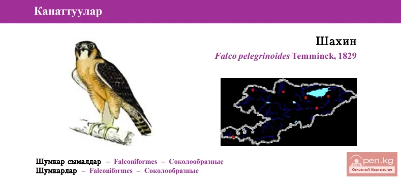 Status: Category III, Critically Endangered, CR: R. Kyrgyz ornithologists are keen to reconsider the current status of the Barbary Falcon in the IUCN list. It prefers rocks and clay precipices in the midlands. Breeds in the mountains around Issyk-Kul and Song-Kul lakes, along the Naryn River, in Kyrgyz, Talas, and Alai mountain ridges. It is estimated that up to 10 breeding pairs occur in Kyrgyzstan. Lays 2-5 eggs in late February, incubates for 33 days. Juveniles leave nests in 43 days. Lives largely on birds like ducks, partridges, pigeons, etc., preys only in the air. Captured by smugglers during the nesting season is a major threat. Included in the Kyrgyz Red Book of 1985. It is recommended to establish protected areas around nesting sites.