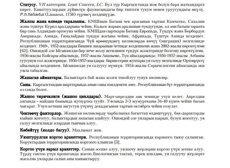 Status: Category VII, Least Concern, LC. Migrates in the Chu Valley and Issyk-Kul oblast, along the Atbashy River. Few pairs were observed during nesting time near Orto Yryukty Village in the eastern part of the Issyk-Kul oblast; probably, the species nests near the lake. Additionally, 2 nests were recorded next to Sary-Chelek Lake in the south. Prefers clean lakes and ponds with fish and trees along the shores. Exact numbers are unknown. Arrives in March-April, lays 2-3 eggs at the end of April-beginning of May, and incubates for 34-40 days. Autumn migration starts from the third decade of August until October. Increased economic development of fish-rich lakes and ponds, tree felling, reduction of fish numbers, and destruction of nests are major limiting factors. There is no data on holding in captivity. It is recommended to identify nesting sites, assess the species' density, conduct public education, and create artificial nests to attract Osprey to nest.
