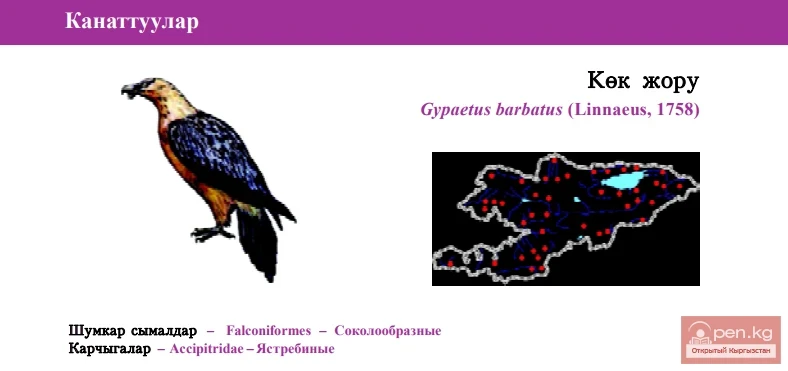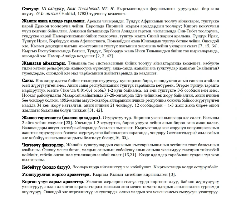 Status: VI category, Near Threatened, NT: R. Occurs in all major ridges of Western, Northern, Central, Inner Tien Shan, as well as in Pamir-Alai Mountains. Prefers highlands of Tien Shan and Pamir-Alai Mountainous Systems, next to wild goats and sheep. Lammergeier is one of the usual resident birds of prey in highlands. The density of it in the north of the country is 0.01-0.4 individuals per km². There were bigger flocks recorded in the south, altogether 34 Lammergeiers were observed for August-September, 1992. Out of those, 21 were adults, 12 - 1-3 years old and only one - juvenile of this year. Starts to nest quite early in winter time, lays 1-2 eggs but only one chick usually survives. Juveniles are seen in August-September. Feeds on carcasses, occasionally hunts after marmots, hares, and other appropriate prey. Limiting factors are reduction of wild sheep and goats stocks. Lammergeier is not held in captivity in Kyrgyzstan. Included in Kyrgyz Red Book of 1985. Hunting of it has been prohibited in Kyrgyzstan since 1968. It is recommended to protect breeding colonies, organize ecological tourism by making hides near sites with artificial feeding. It is necessary to obtain exact figures on numbers of Lammergeier populations in Kyrgyzstan.