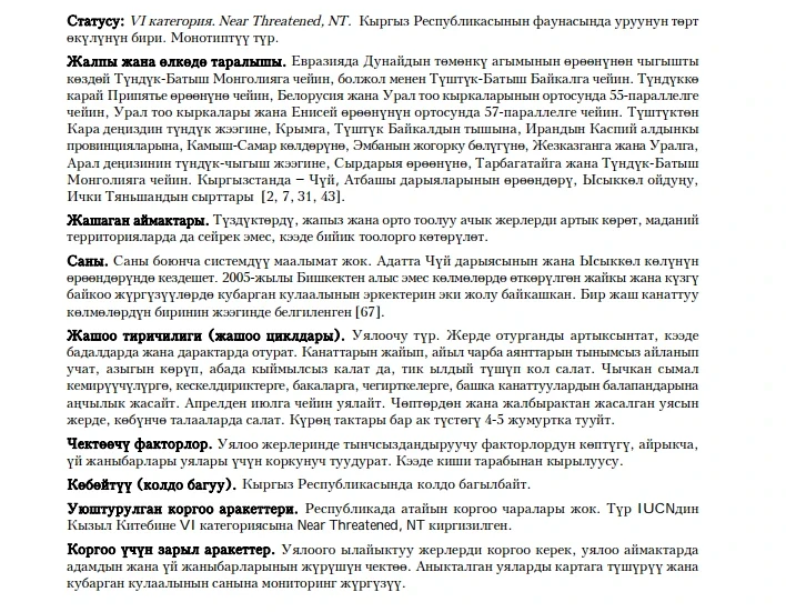 Status: VI category, Near Threatened, NT. Monotypic species. Occurs in river valleys of Chu, At-Bashi, Issyk-Kul Regions, in highlands of Inner Tien Shan. Prefers open plains, low-, and midlands, cultivated landscapes, rarer in highlands. No systematic data on numbers. Males of Pallid Harrier and one juvenile were observed twice at the census transects in summer-autumn 2005. Nesting bird. Prefers to sit on the ground compared to bushes or trees. Feeds on lizards, frogs, grasshoppers, and nestling birds. Builds nests from leaves and grass on the ground in agricultural fields. Lays 4-5 eggs. Limiting factors are disturbance at the nest sites by humans and domestic animals, such as cattle and dogs, rarer - direct killing as potential chicken lifters. No evidence of holding in captivity. Special conservation measures have not been undertaken so far. It is recommended to protect nesting sites, limit human and domestic animal influence during nesting time, to map identified nests and conduct monitoring of Pallid Harrier’s numbers.