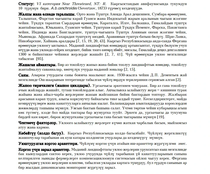 Recommended conservation measures. Nesting sites of this species in cultivated landscapes need to be protected from illegal felling in winter, consider a compensation system for farmers for damage to poultry during nesting time. It is necessary to identify nesting sites in the Fergana Valley, map the identified nests, and conduct monitoring of the annual population dynamics of this species.