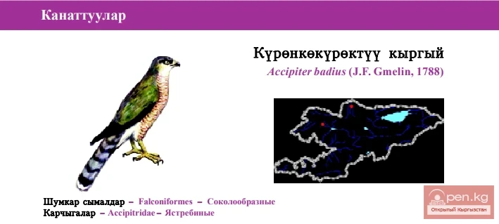 Status: VI category Near Threatened, NT: R. One of ten species of the genus in the avifauna of the Kyrgyz Republic, inhabiting the subspecies Accipiter badius cenchroides (Severtzov, 1873).