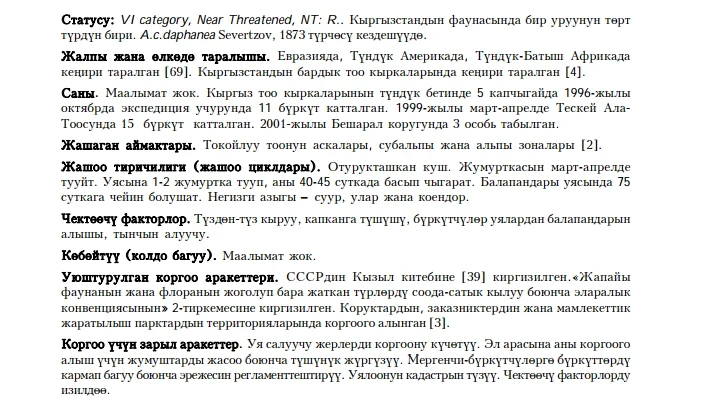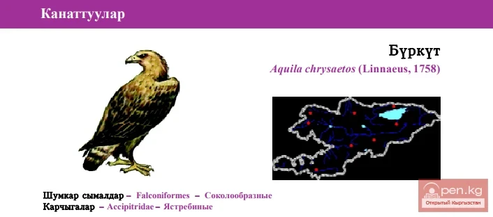 Status: VI category, Near Threatened, NT: R. Resident bird, occurs throughout Kyrgyzstan mountains. Prefers rocky sites in forest, subalpine and alpine belts. No systematic data on numbers are available. Eleven Golden Eagles were seen in Kyrgyz Mountainous Ridge, 15 birds in Issyk-Kul oblast in 1999, 3 birds - in Besh-Aral zapovednik (protected area). Lays 1-2 eggs in March-April, incubates those for 40-45 days, juveniles leave nests in 75 days. Removal of juveniles from nests by local hunters for hunting purposes, death in traps, direct killing are major limiting factors. No breeding in captivity is known. Included in the USSR Red Book of 1984, Kyrgyz Red Book of 1985. It is proposed to strengthen Golden Eagle nests protection efforts, conduct public education campaigns, and develop policy and rules for local traditional Eagle hunters, map nest sites.