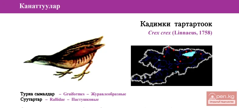 Status: Category VI, Near Threatened, NT. Monotypic species. Migrates and breeds in the Chu and Suusamyr Valleys, Issyk-Kul Region, floodplain vegetation of the Naryn and At-Bashi Rivers. Prefers cultivated and meadow habitats in low- and midlands. Common in shore bushes of Issyk-Kul Lake (2 individuals per square km), in the fields (3), in the meadows of the forest belt. During migration, the bird numbers grow, dozens of Corncrakes feed in marshes of the Chu Valley in May. It is rare in spruce forests. Arrives in the beginning of May and starts to display, usually during nighttime. Prefers running among grass rather than flying. Feeds on insects, rarer in seeds of the crops. Lays 8-10 eggs, fledglings appear in the second half of June. Departs in September. Limiting factors are birds of prey and domestic animals. There is no information on keeping it in captivity. No special protection measures have been developed and introduced in the past. It is recommended to protect nesting sites.