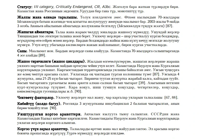 Population. No exact data available. The population is decreasing everywhere, in Kazakhstan it has decreased fourfold compared to the 1970s [88]. On May 9, 2003, three individuals were observed in the area of the village of Ananyevo (northern shore of Lake Issyk-Kul), with a photo available [89].