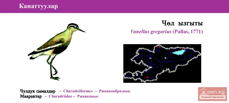Distribution general and in the country. Steppes of Eurasia from Ukraine to Eastern Kazakhstan. In Kyrgyzstan, it has not been studied; there are fragmentary reports of sightings of the Sociable Plover on the western shore of Lake Issyk-Kul in the 1970s. [87].