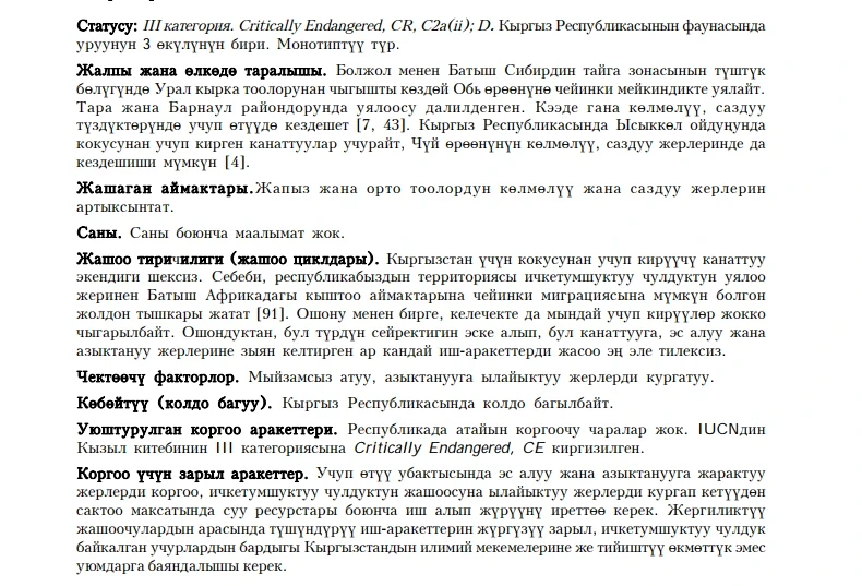 Recommended conservation measures. It is necessary to protect sites suitable for resting and feeding during migration, manage water resources to prevent the drainage of habitats suitable for the Slender-billed Curlew. It is important to conduct awareness-raising work among the local population; all cases of Slender-billed Curlew sightings should be immediately reported to scientific institutions and relevant NGOs in Kyrgyzstan.