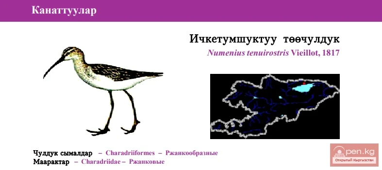 Life style (life cycles). For Kyrgyzstan, it is undoubtedly a vagrant species, as the territory of the republic lies outside the usual migration routes of the Slender-billed Curlew from nesting sites to wintering grounds in West Africa [91]. At the same time, such vagrancies cannot be excluded in the future, therefore, considering the extreme rarity of this species, any actions that harm the bird itself and its resting and feeding sites are extremely undesirable.