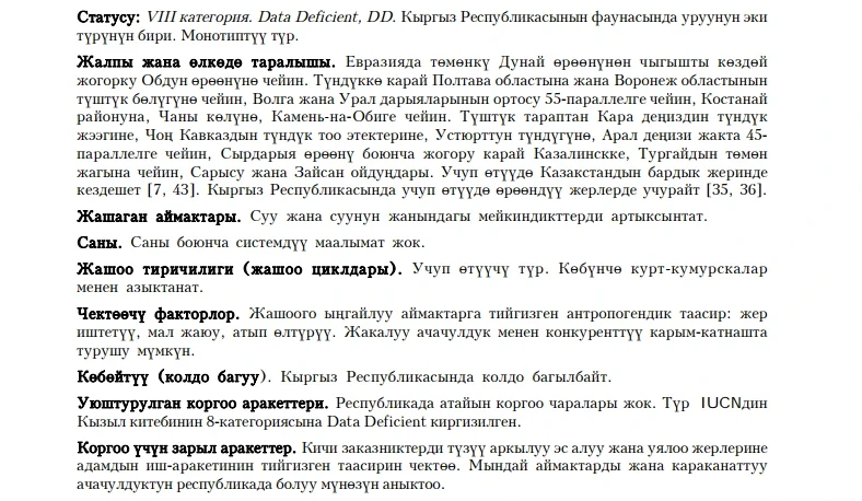 Status: Category VIII, Data Deficient, DD. One of two species of the genus in the fauna of the Kyrgyz Republic. Monotypic species.