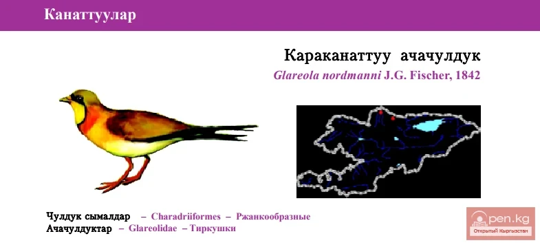 Status: Category VIII, Data Deficient, DD. Monotypic species. Rare migrant in the plains of Kyrgyzstan. Prefers wetlands and neighboring dry habitats. No systematic data on numbers are available. Feeds on insects; competitive relationships with Glareola pratincola (Linnaeus, 1766) are not excluded. Limiting factors include plowing up suitable habitats, overgrazing, and occasional game shooting. The species is not held in captivity in the country. There are no special protection measures undertaken either. It is necessary to develop protection measures and identify habitats where the Black-winged Pratincole may occur and even nest.