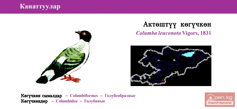 Status: VII, Least Concern, LC. One of six species in the genus found in the fauna of Kyrgyzstan. The nominative subspecies Columba leuconota Vigors, 1831 is present.