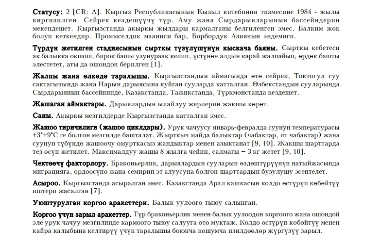 Status: Category 2 [CR: A], critically endangered in Kyrgyzstan, locally distributed in Amudar-Syrdarya endemic representative of the monotypic relic genus. The species is naturally spread in the basins of the Amudarya and Syrdarya Rivers, was observed in the lower courses of the Kashkadarya and Zeravshan Rivers; in Kyrgyzstan it was registered in the Toktogul Water Reservoir and in tributaries of the Naryn River. This predatory fish (up to 3 kg in weight) is rheophilic, preferring muddy waters, feeding on daces and minnows as well as bottom-living invertebrates; reproductive age is 6-7 years, spawning time is January - February, fertility is 22-190 thousand eggs. The number in the country is extremely small, with no records over the last years. Limiting factors: poaching, destruction of the natural regime of river flows as a result of hydro-building. It is neither bred nor protected in Kyrgyzstan. It is necessary to prohibit poaching as well as any fishery during the spawning period; additional study of distribution for the elaboration of artificial rehabilitation is also recommended.
