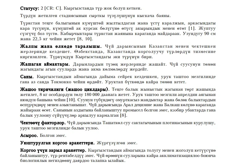 Status: Category 2 [CR: C], extinct in Kyrgyzstan, locally distributed Aral endemic subspecies of Aral-Caspian species, one of two congeners in the fauna of the country. The subspecies was naturally distributed in the Amudarya River (in the past), Kashkadarya, Zeravshan, Syrdarya, and Chu Rivers; in Kyrgyzstan, it is known from the Chu River in the past. This is a large fish, up to 90 cm in length and 22.5 kg in weight, feeding on bottom-living invertebrates and young fish; spawning time is from the end of April to the beginning of June. The age of reproductive ability is 4 years, with a fecundity of individuals weighing 8 kg being 180,000 eggs. It has always been rare in the country, and sometimes spawners were observed upstream of Tokmak town in insignificant numbers. Limiting factors include the construction of the Tashat-Kul Weir and fishing during the spawning period. It was not a fishery species in Kyrgyzstan due to its small number. Neither bred nor protected. It is recommended to reacclimatize this species in water reservoirs in the Chu Valley.