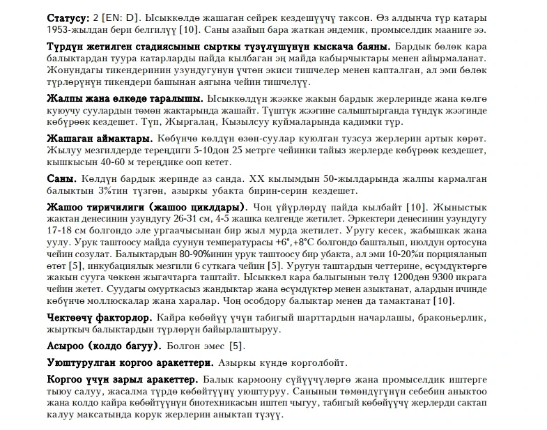 Status: 2 [EN: D]. A rare taxon inhabiting Lake Issyk-Kul. Its independent species status was established in 1953 [10]. An endemic species with declining numbers, it has commercial significance.