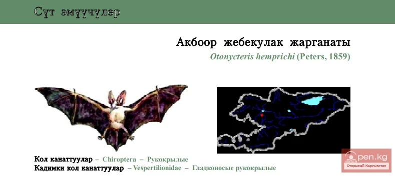Distribution general and in the country. From Algeria and Egypt through the Middle East to the Western Tian Shan, Pamir, and Kashmir. In Kyrgyzstan, a specimen was collected on May 18, 1966, in the southern foothills of the Chatkal Range (10 km northwest of Tash-Kumyr), almost 300 km northeast of the nearest find in Uzbekistan. In 1992, bats were captured to study their feeding behavior in the rocky foothills of the Aravan district in the Duvakhan, Chil-Ustun, and Ashkana areas at an altitude of 850 m [42].