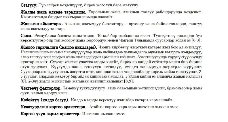 Status: VII category, Lower Risk/least concerned - LR/lc. Rare species, occurs in all mountainous ridges in Kyrgyzstan. Prefers stony-rocky habitats in mid- and highlands. Density is low, less than 1 individual per 10 km², it is higher in the south, very low in Central and Eastern Tien Shan. The marten is active throughout the year. Feeds on small rodents and pikas, pursuing them among stones and rocks. It does not avoid hunting birds. The marten has individual territories but may roam from place to place. The mating season starts in June-August, and young animals appear in April-May. There are 2-5 young animals in the litter, which start to see light after one month. Limiting factors include low fertility, lack of food, poaching, and severe cold winters. No special protection measures are undertaken. It is recommended to reduce grazing around suitable habitats and combat poaching.