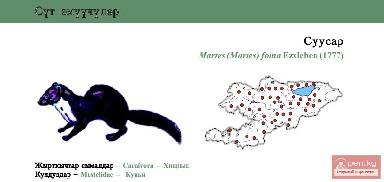 Distribution in general and in the country. Mountainous areas of Europe and Asia. In Kyrgyzstan, it inhabits all mountain ranges [3]. The subspecies Martes (Cartes) foina intermedia Severtzov, 1873 is found in Kyrgyzstan.