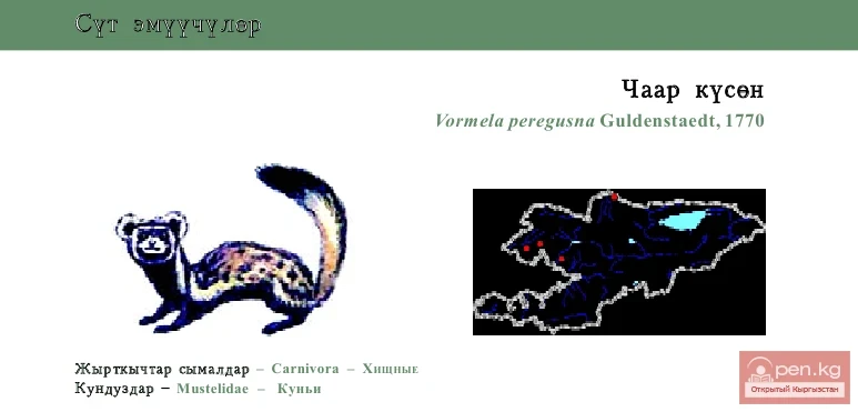 Vormela peregusha Guld. (in Kyrgyz: чаар кусон) In appearance, the Vormela resembles the forest...