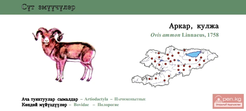 Status: Three subspecies with different statuses inhabit the territory of the republic. The Pamir Mountain Ram (Ovis ammon polii Blyth, 1841), status - 3. The Tian Shan Mountain Ram (Ovis ammon karelini Severtzov, 1873), status - 2. The Severtzov Ram (Ovis ammon severtzovi Nasonov, 1914), status - 1.