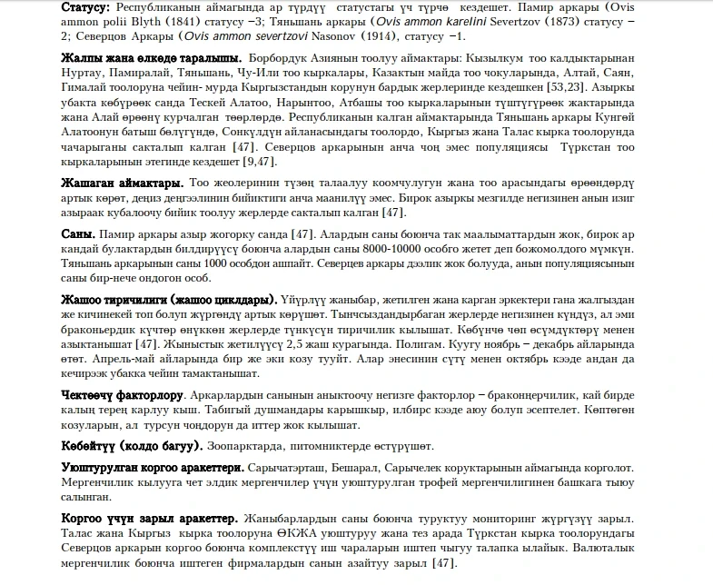 Status: V category, VUA2cde. Inhabits all mountainous ridges of Kyrgyzstan, karelini is sporadic in Sandalash, Talas, Kyrgyz, Djumgal, Kungei, and Teskei Ridges, Song-Kul Region, common in syrts of the eastern part of Tien Shan, but not in Arpa and Ak-Sai Localities, polii occurs in Arpa and Ak-Sai, Chatyr-Kul Lake Region, Kokshaal-Too, Alai Ridge. A typical inhabitant of highland steppes, meadows, and open midlands. Helicopter census demonstrated that there were 400-700 karelini argali in Talas Ridge, 1,200 animals in Sarychat-Ertash zapovednik (protected area), in the rest localities - around 100 animals. The density of polii argali obtained from helicopter census is 10 animals within a 10 km transect in Arpa, 27 in Ak-Sai, 30-39 in Korumdu Locality. Numbers of that subspecies dropped by almost twice over the last 10 years due to commercial hunting, especially males reducing by 12-18 times. Current density of that subspecies is 20.2-23 animals per 1,000 ha. Males of karelini join females in autumn; the heating season starts in October-November, and males fight with each other. Males start mating at 5 years. Pregnancy lasts for 160-165 days; females deliver 1 or 2 young animals in March-April. The mating season of polii starts in November-December. Females deliver 1 young animal in May-June. Limiting factors for both subspecies are poaching, commercial hunting for polii, predators, and heavy snow winters. Breeds successfully in captivity. The karelini subspecies was included in the Kyrgyz SSR and the USSR Red Books, protected in Sarychat-Ertash zapovednik (protected area). It is recommended to protect argali in habitats where they may inhabit, limit cattle grazing in suitable argali habitats, establish a protected area in Talas Ridge, and control the stock of wolves.