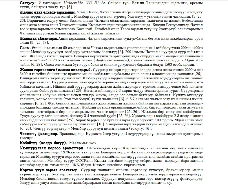 Status: V category, Vulnerable, VU, B1+2c. Rare endemic species of Western Tien Shan. Inhabits in Chatkal Mountainous Ridge, westwards from Chapcham Pass in upper belts of Kasan-Sai, Gava-Sai and Ters Localities. According to reports of Besh-Aral zapovednik (protected area), there were around 10,000 animals registered in census in 1999. Later internally displaced people were settled next to protected area starting cattle breeding and hunting after marmots. Several years ago those people moved to a different place, stock of marmots have been slowly recovering. Prefers subalpine and alpine belts within 2,200-3,400 m (7,200-11,100 feet) above sea level. Marmot burrows located next to stone or meadow sites. Hibernates in winter for 6.5 -7 months, wakes up at the end of March- beginning of April. Breeds once a year, not all females mate. Juveniles appear outside at the end of May. Limiting factors are poaching, predators. No data on captivity holding. Included in protected list since 1975, Besh-Aral zapovednik was established with major purpose to protect that species. Included in the USSR Red Data Book. It is recommended to strengthen measures against poaching, increase Besh-Aral zapovednik square, research the biology of the species.