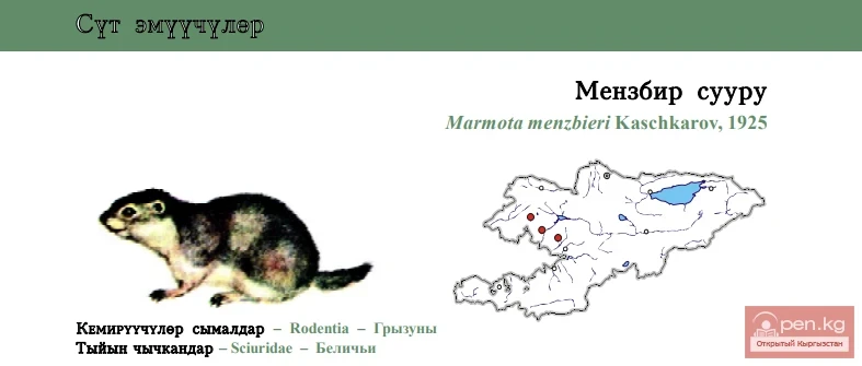 General distribution and in the country. Mountain areas in the upper reaches of the Ugam, Pskem, Chatkal, and Angren rivers. Two subspecies of Menzbier's marmot have been identified - Ugam (South Kazakhstan region [26]) and Chatkal (Uzbekistan, Tajikistan, Kyrgyzstan) [3, 25].