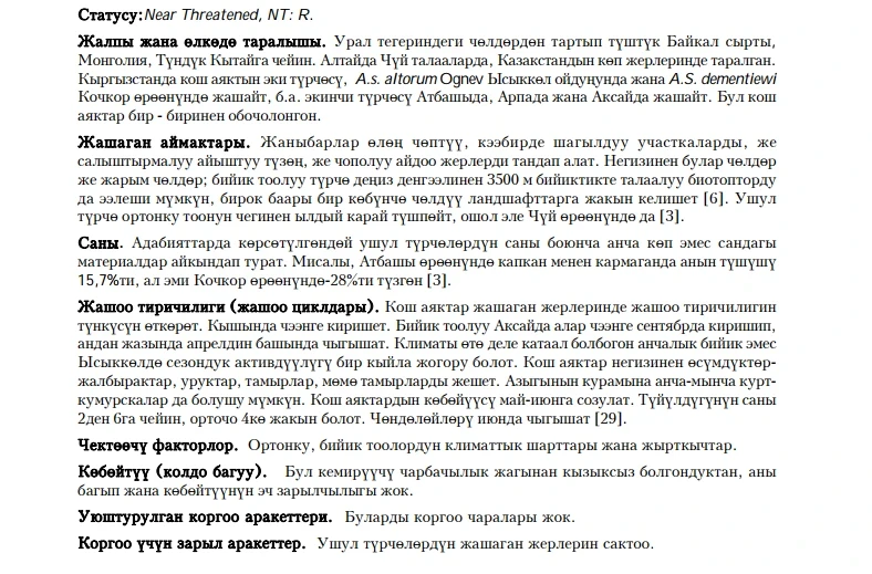 Status. VI, Near Threatened, NT: R. A.s. altorum occurs in Issyk-Kul Region and Kochkor Valley, A.s. dementiewi - in At-Bashi, Arpa, and Aksay Rivers valleys. Those two races are isolated from each other. Prefers plain or slightly sloping habitats, sometimes with pebbly spots with wilted grass. Those are deserts and semi-deserts. Data on numbers is scarce. Percentage of jerboas’ falling into traps is 15.7 in At-Bashi Valley, and 28 - in Kochkor Valley. Jerboas are nocturnal animals, hibernate in winter time. In highland Ak-Say Valley, Jerboas start to dormant in September, end in beginning of April. In Issyk-Kul Region, waking season is longer. Uses for food leaves, seeds, bulbs, roots, and tubers, sometimes - in insects. Limiting factors are weather conditions in highlands and predators. No need to breed it in captivity. No special protection measures are undertaken so far. It is recommended to conserve habitats.